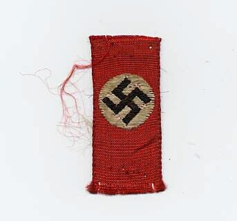 Rood rechthoekig embleem met op een rond wit veld een zwart hakenkruis.