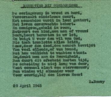 Doorslag op dun lichtgroen papier van een oorlogsgedicht.