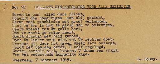 Getypt gedicht van twaalf regels over de plicht tot het ondersteunen van het hongerige kind. Het betreft gedicht nummer 72.