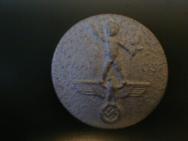 Een rond zilverkleurige metalen reversspeldje met de afbeelding in reliëf van een naakt jongetje met de rechterarm geheven en in de linker een tak met eikenblaadjes. Hij staat wijdbeens op de Duitse rijksadelaar met gespreide vleugels en in de klauwen het hakenkruis. Op het speldje: "1 Mai 1937".
