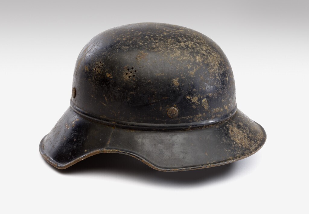 Zwarte Duitse luchtbeschermingshelm, model gladiator Luftschutz met op de linker en rechter zijkanten luchtgaten. Tekst in witte letters: :Vertrieb genehmigt". Aan de binnenkant in de nek: "RL 2-40/Z Hockstpre RM 8".