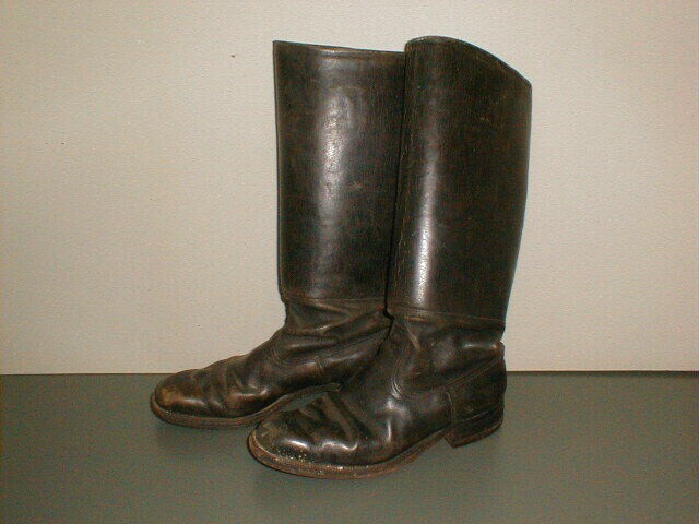 Een paar zwart leren laarzen, hoog model tot boven aan de kuit. De hakken zijn verstevigd met een band metaal. De zool bestaat uit twee lagen dik leer. In de laars zijn twee katoenen lussen aangebracht om de laars aan op te hangen en een leren riempje. Op de zool: "46 7 803/38".
