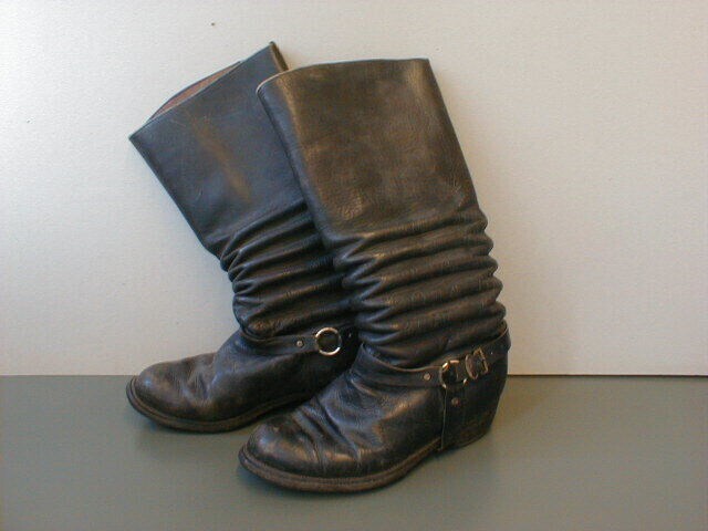 Een paar hoge instap laarzen van zwart leer. De zolen bestaan uit twee lagen leer. Om de enkel heen en onder de zool door een lerenband met metalen gesp. Het onderbeen gedeelte bestaat uit geplooid (zoals bij een harmonica) leer. De binnenkant is gevoerd met bruin leer.