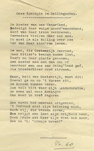 Twee identieke getypte gedichten van vier coupletten over koningin Wilhelmina in ballingschap.