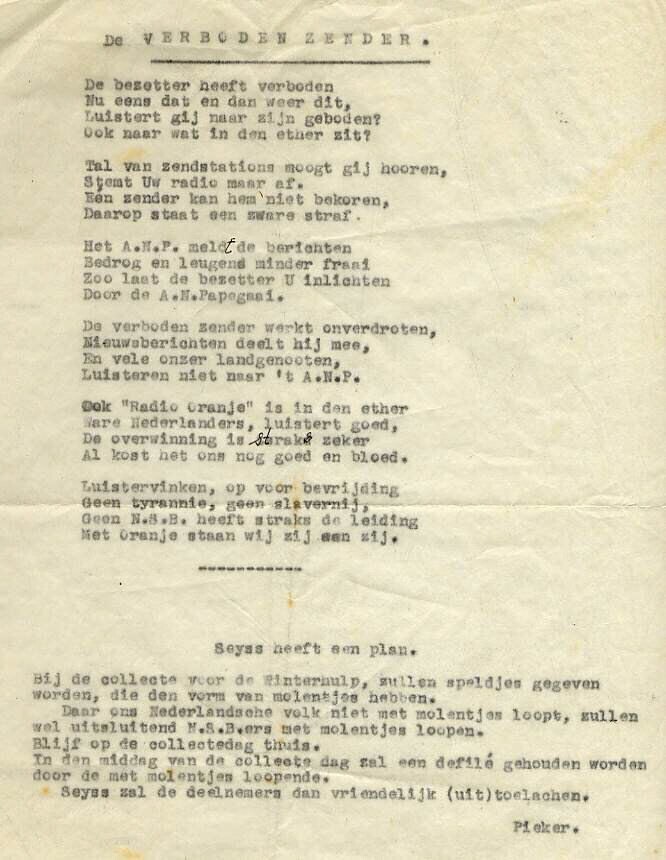 Satirisch gedicht met zes coupletten van elk vier regels. Onderaan een melding over een komende collecte van de Winterhulp Nederland op 29 en 30 november 1940. Ondertekend door 'Pieker'. Doorslag op dun papier.