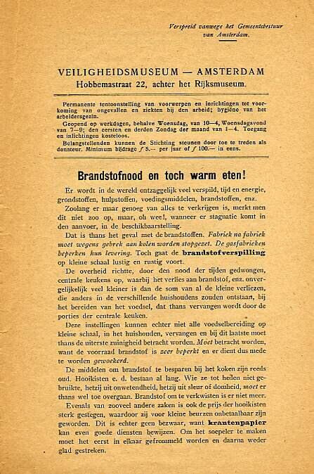 Een aan twee kanten bedrukt blad met titel: "'Brandstofnood en toch warm eten!" uitgegeven door het Veiligheidsmuseum te Amsterdam. Het betreft informatie om brandstofverspilling te voorkomen en het nut van krantenpapier in de huishouding. Op de achterkant een voedseltabel met kooktijden.