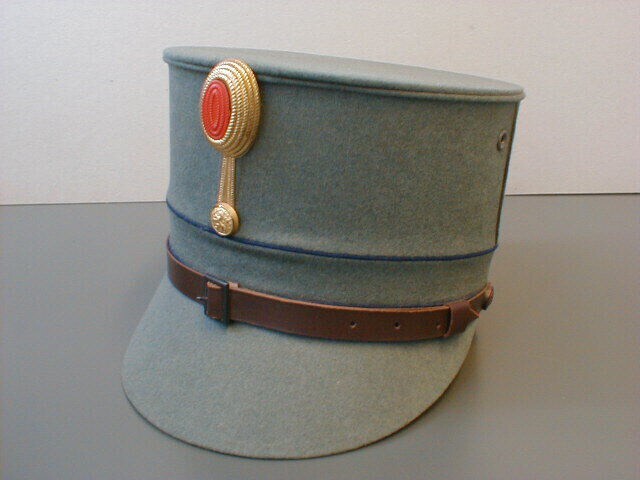 Kepi van de afdeling infanterie, anno 1940 (ongebruikt). Hoog model, van grijs laken. Twee blauwe biezen op 1cm en 4cm van de rand. Op de voorkant een goud met oranje kokarde van metaal. Hieronder zit een stiftknoopje met de afbeelding van de Nederlandse leeuw erop. Boven de klep zit een leren riem, vastgemaakt aan de kepi met twee knopen. Op de knopen is een afbeelding van de Nederlandse leeuw. De binnenkant is gevoerd met beige stof. In de voering K. Petersen Ede, in gouden letters.