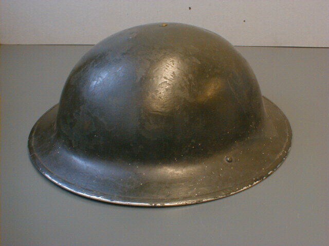 Groene Engelse legerhelm. No. B M R I N93, uit 1941. De helm is overgeschilderd en het binnenwerk is vernieuwd. Dit binnenwerk bestaat uit een kunstleren hoofdband en een kinband van stof. Op het binnenwerk staat gestempeld: 1948.