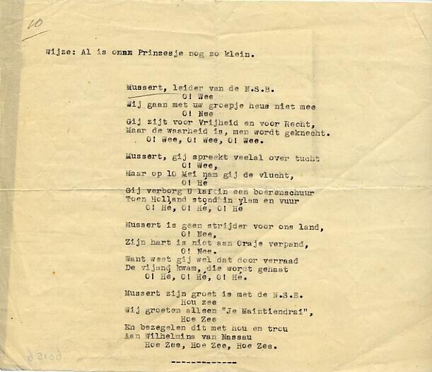 Satirisch gedicht van vier coupletten op de wijs van : 'Al is ons prinsesje nog zo klein' over Mussert.