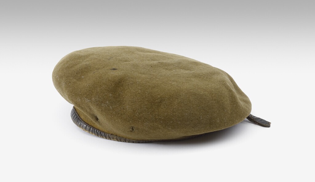 Een groene baret met zwartleren hoofdband. In de buitenrand zijn twee gaten aangebracht. Waarschijnlijk voor de bevestiging van een embleem. De voering is van beige stof.