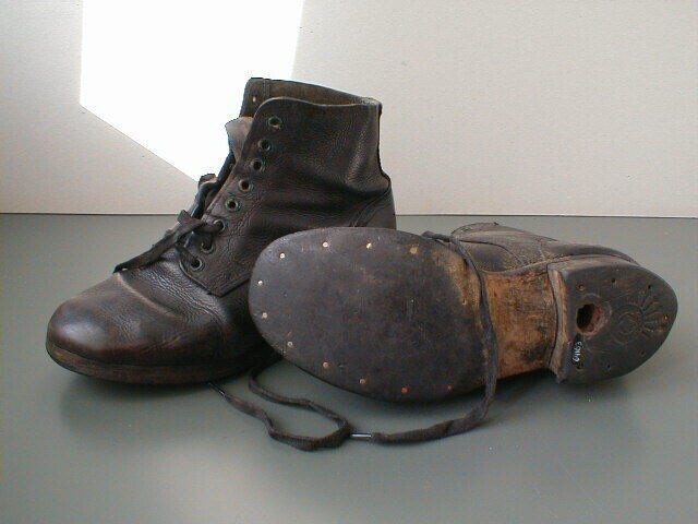 Hoge militaire schoenen van zwart leer. De zool is van leer met slijtage plekken aan de zijkant en een gat in het midden van de hak. Aan de voorkant een vetersluiting met metalen ringen.