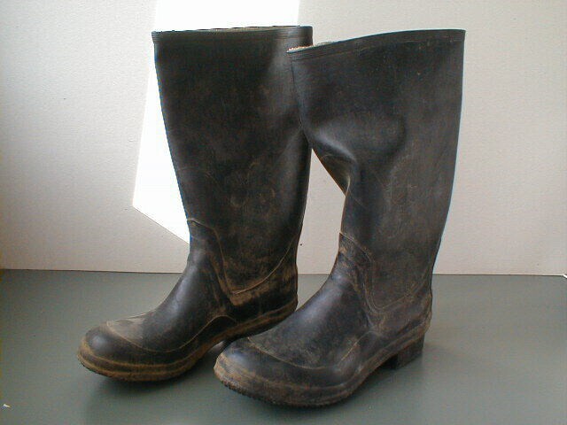Een paar zwart rubberen kaplaarzen met gelijmde hakken. Op de zool staat de merknaam: Bata. De voering is van canvas, aan de linkerkant zit een stempel: 8207 97977-668.<br>