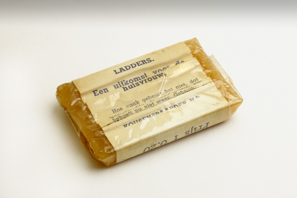 Blokje 'Kousenspaarder' in een wit wikkel met blauw gedrukte tekst. Het geheel verpakt in cellofaanpapier. Het blokje zelf is van een transparant bruine materie waarschijnlijk een soort hars. Het werd gebruikt om ladders en gaatjes in dameskousen te voorkomen.
