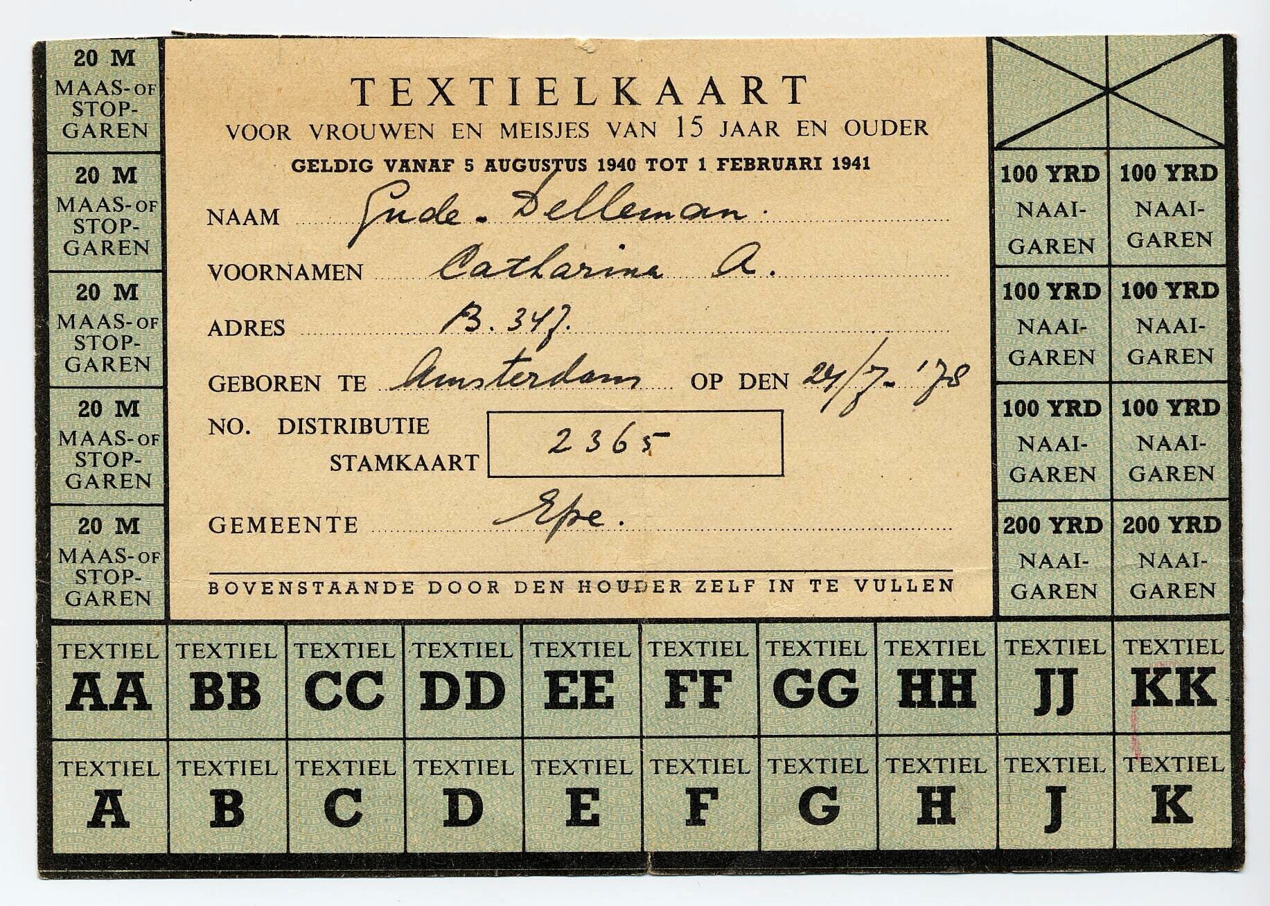 Drie gebruikte textielkaarten: een 'Textielkaart voor vrouwen en meisjes van 15 jaar en ouder geldig vanaf 5 augustus 1940 tot 1 februari 1941'; een 'Textielkaart voor mannen en jongens van 15 jaar en ouder geldig vanaf 5 augustus 1940 tot 1 februari 1941'; een 'Textielkaart voor meisjes van 3 tot 15 jaar geldig vanaf 1 febr. 1941 tot en met 31 aug. 1941'.