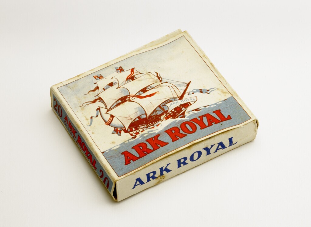 Pakje Britse sigaretten zonder inhoud. Aan de voorzijde de afbeelding van een 17e-eeuws schip met volle zeilen op zee. Aan de achterzijde een wimpel voor de volle maan met de merknaam 'Ark Royal'. Ook op het schuifkarton dat de sigaretten bijeenhield de merknaam in blauw; op het lipje ervan de tekst 'Cool as a sea-breeze '