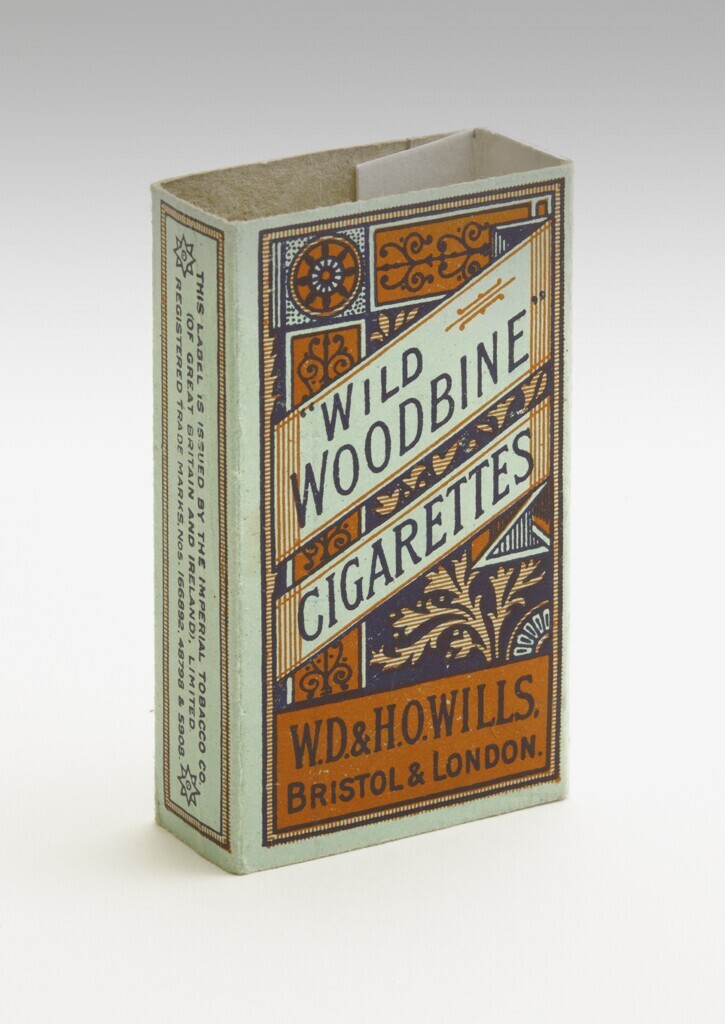 Een lichtgroene kartonnen omslag met rode en blauwe opdruk van een sigarettenverpakking. Op de voorkant over een geornamenteerde achtergrond in twee schuine banden: 'Wild Woodbine Cigarettes'. Hieronder op een rood veld: 'W.D. & H.O. Wills. Bristol & London'. Op de achterkant over een geornamenteerd rood veld, een lichtgroen veld met: 'Every genuine package of Wild Woodbine Cigarettes has the signature thus:' met de handtekening van de fabrikant.