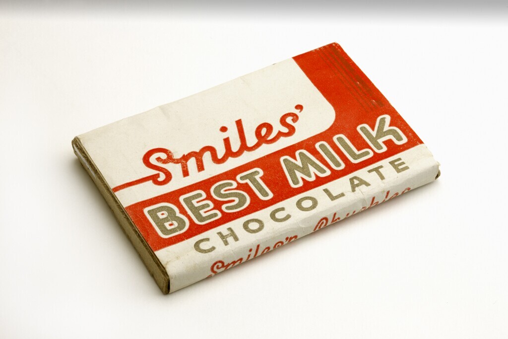 Een witte papieren wikkel van een chocoladereep met rode en gouden opdruk. Op de voorkant in rood 'Smiles' en op een rode band in goud: 'Best Milk' en daaronder op de witte ondergrond in goud: 'Chocolate'. Op de achterkant de naam van de fabrikant: 'Hamblin-Metcalfe ltd. Kitchener, Canada'.