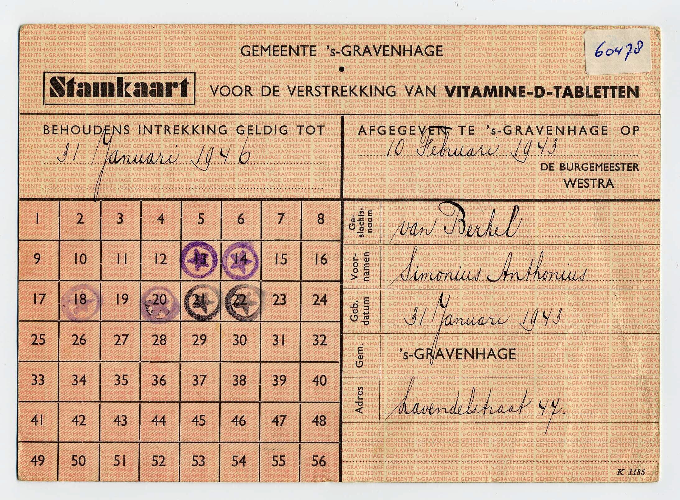 Twee roze 'Stamkaarten voor de verstrekking van Vitamine-D-tabletten'. Stamkaart (K1185) van S.A. van Berkel, geboren op 31 januari 1943, afgegeven op 10 februari 1943 en geldig tot 31 januari 1946 en stamkaart (B.V.B.508-C 3459) van E.J. van den Berg, geboren op 5 mei 1947, afgegeven op 6 mei 1947 en geldig tot 5 mei 1950. Op de achterkant van de kaarten de restricties.
