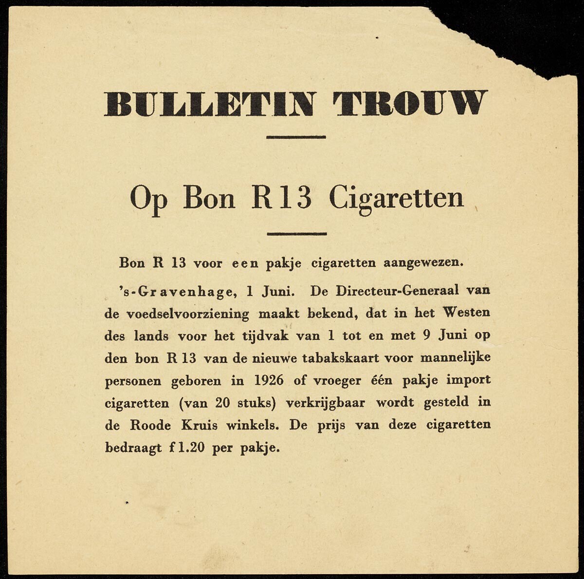 Een bekendmaking in de vorm van "Bulletin de Trouw" van de Directeur-Generaal van de voedselvoorziening. Deze maakt bekend dat in het Westen des lands van 1 tot en met 9 Juni op Bon R 13 voor mannelijke personen geboren op 1926 of vroeger één pakje import cigaretten (20 stuks) in de Roode Kruis winkels zijn te kopen tegen de prijs van f 1,20 per pakje.