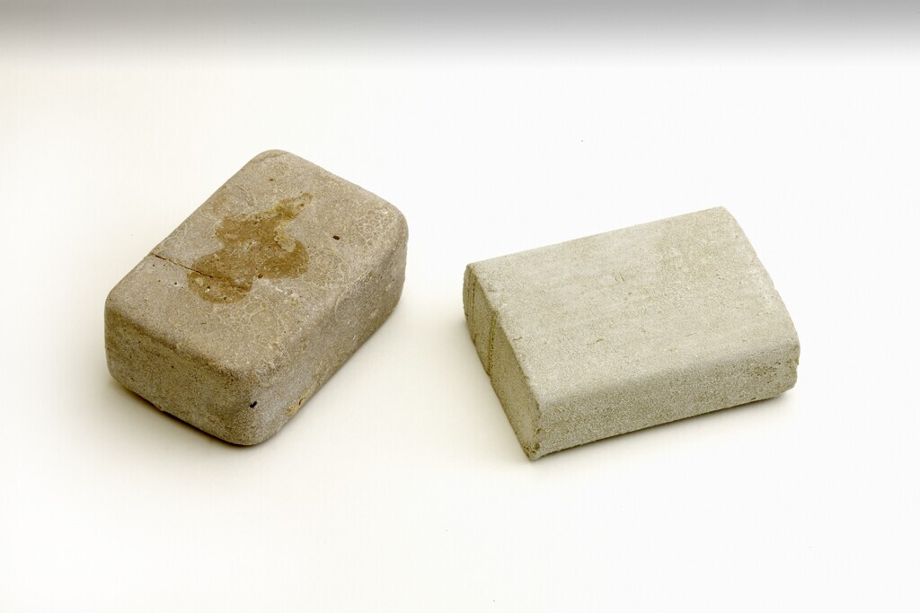 Twee stukjes surrogaatzeep: kleizeep, gemaakt van grijs materiaal.