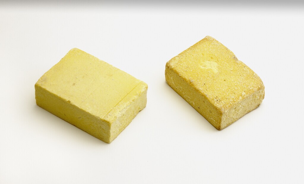 Twee stukjes surrogaatzeep: luchtzeep, gemaakt van een geel en heel licht materiaal.