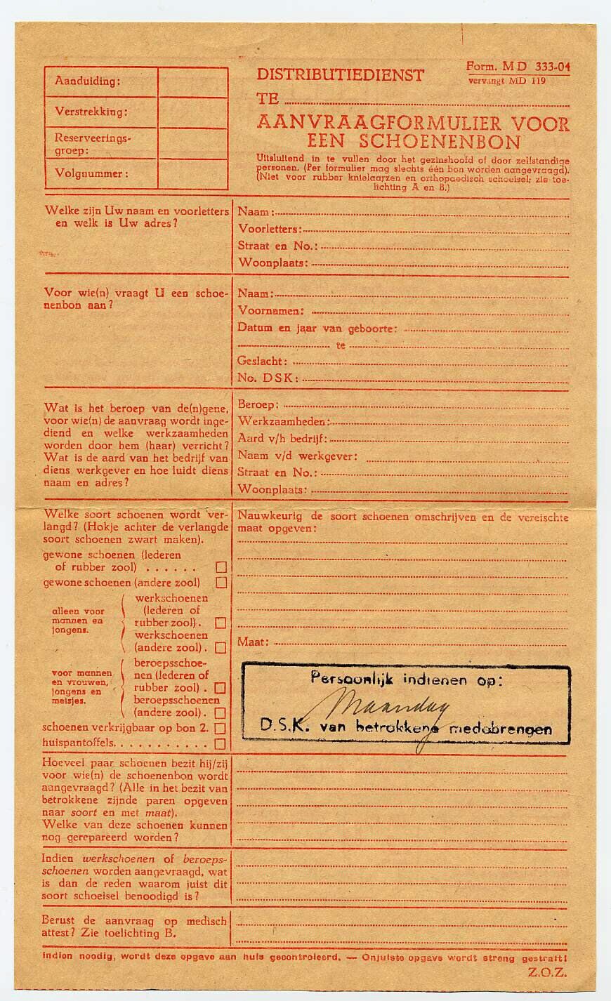 Vijf formulieren voor het aanvragen van schoenen. Op twee van de schoenbonnen is de tekst gestempeld: 'Persoonlijk indienen op ... D.S.K. van betrokkenen medebrengen’. Een van de formulieren is ingevuld door J.W. van Zijverden. De overige formulieren zijn blanco.<br>