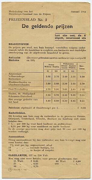 Mededeling van het Directoraat-Generaal van de Prijzen. Een dubbel gedrukte prijzenblad No. 1 met "De geldende prijzen gedateerd: januari 1946. Het betreft: brandstoffen, gloeilampen, huishoudelijke genees- en verbandmiddelen, kruidenierswaren, schoenen, schoonmaakartikelen en waschbehandeling.<br><br>