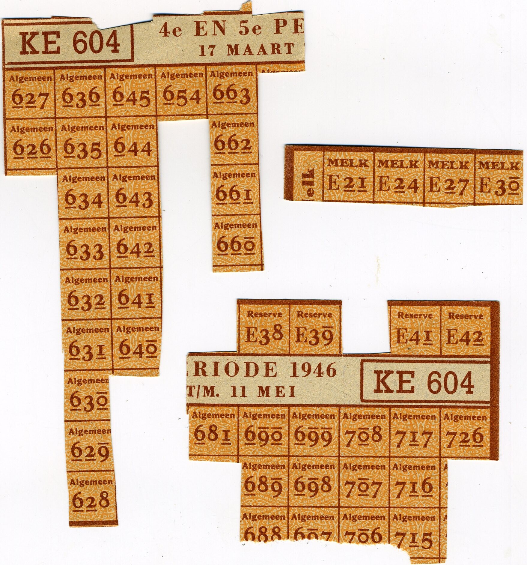 Twee gebruikte Bonkaarten met nog enkele bonnen Algemeen en Reserve, geldig van 17 maart tot en met 11 mei 1946 (vierde en vijfde periode). Voorts nog een strook melkbonnen.