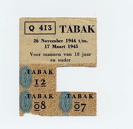 Een gebruikte bonkaart met nog enkele bonnen. Q 413 TABAK, 26 november 1944 t/m 17 maart 1945, voor mannen van 18 jaar en ouder.<br>