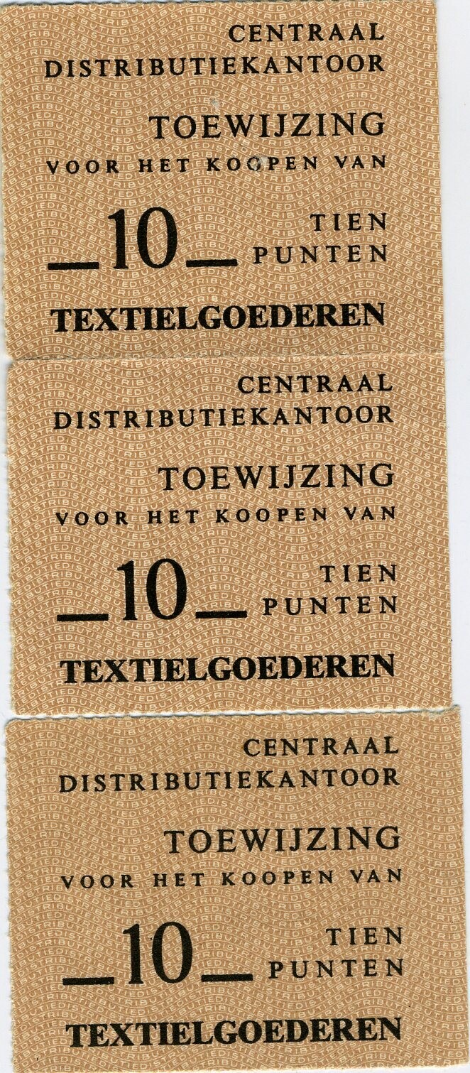 Toewijzingsbonnen 'voor het koopen van Textielgoederen 10 punten'. Zwart en roze.
