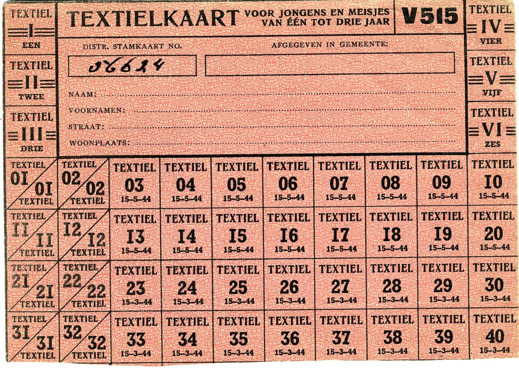 Twee Textielkaarten (V 515) voor jongens en meisjes van één tot drie jaar, geldig op vaste data in 1943 en 1944. Een van de kaarten is ongebruikt.