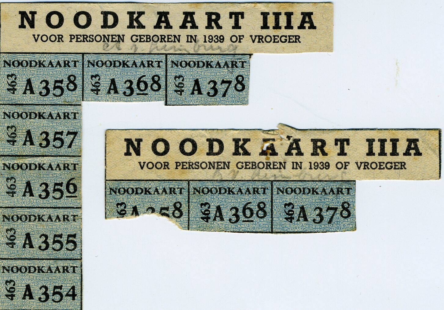 Twee gebruikte blauwe Noodkaarten IIIA voor personen geboren in 1939 of vroeger, met nog enkele genummerde bonnen.