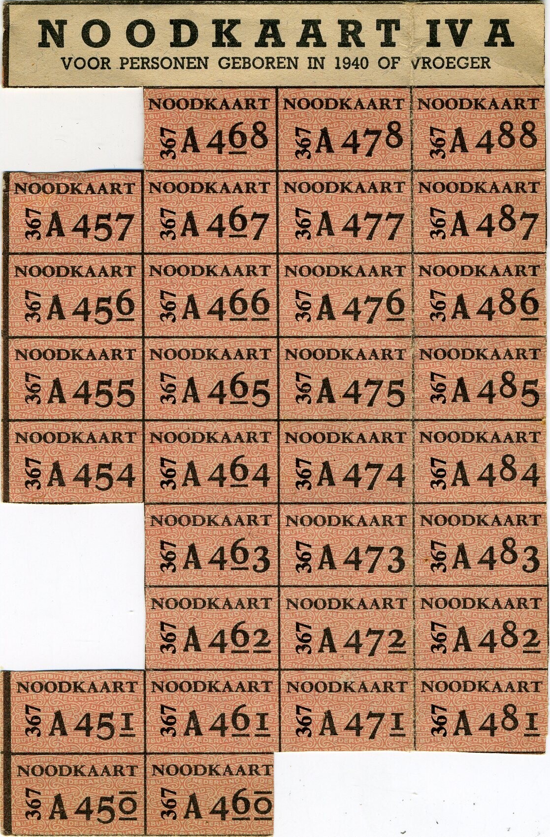 Twee gebruikte exemplaren Noodkaart IV A , voor personen geboren in 1940 of vroeger. Een losse inwisselingsbon.