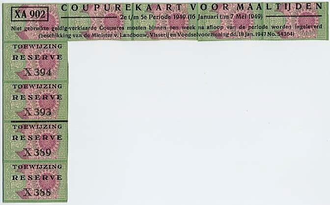Een gebruikte groen paarse coupurekaart voor maaltijden voor de tweede tot en met de vijfde periode 1949. De kaart heeft nog vier bonnen met het opschrift Toewijzing reserve.<br>