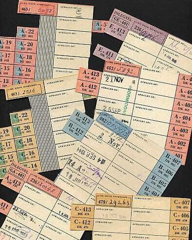 Diverse gekleurde, afgeknipte, gebruikte en genummerde delen van bonkaarten en inlegvellen. Op een aantal kaarten is een datum gestempeld.