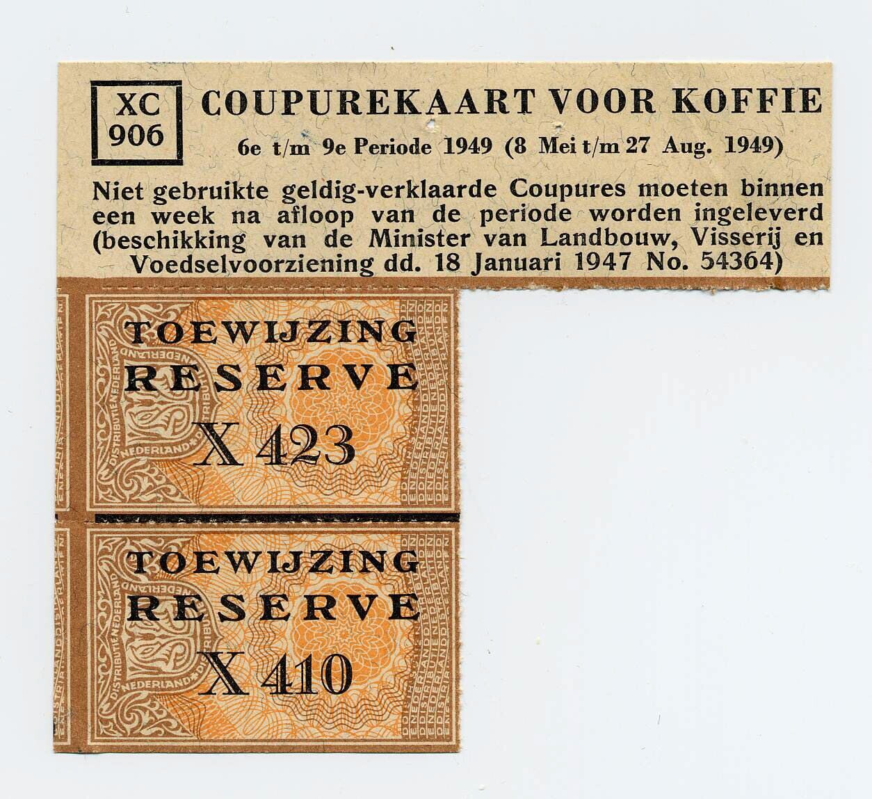Vijf afgeknipte en gebruikte Coupurekaarten voor Koffie, 6e t/m 9e Periode (8 Mei t/m 27 Aug. 1949) met nog twee Toewijzing Reserve bonnen: beschikking van het Ministerie van Landbouw, Visserij en Voedselvoorziening dd. 18 Januari 1947 No. 54364).<br>