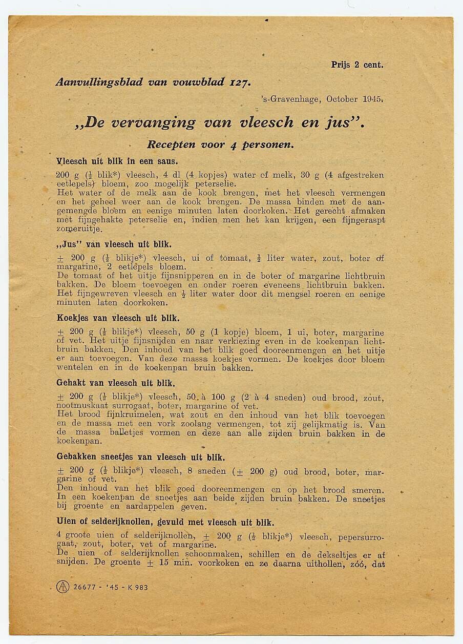 Aanvullingsblad van vouwblad 127 met alternatieve vleesrecepten in verband met schaarste.