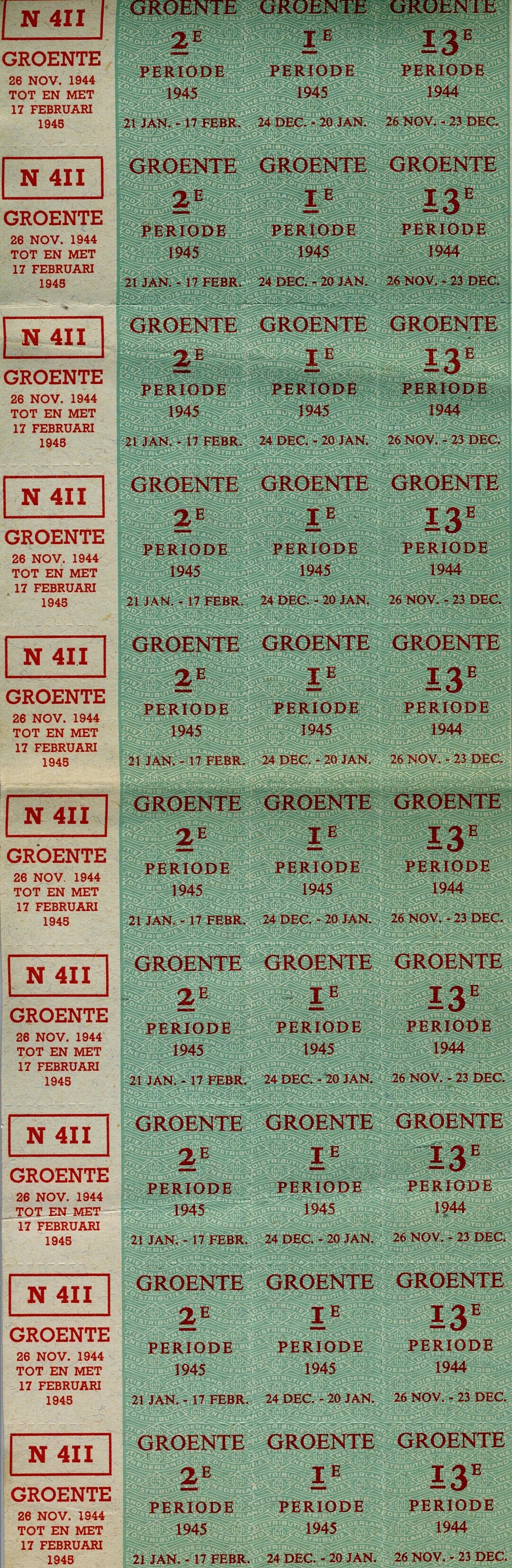Drie bonkaarten voor groente. Twee exemplaren (N 411) zijn compleet en geldig van 26 november 1944 tot en met 17 februari 1945. Kleur. Bonkaart N 403 is incompleet en is geldig van 19 maart tot en met 10 juni 1944.