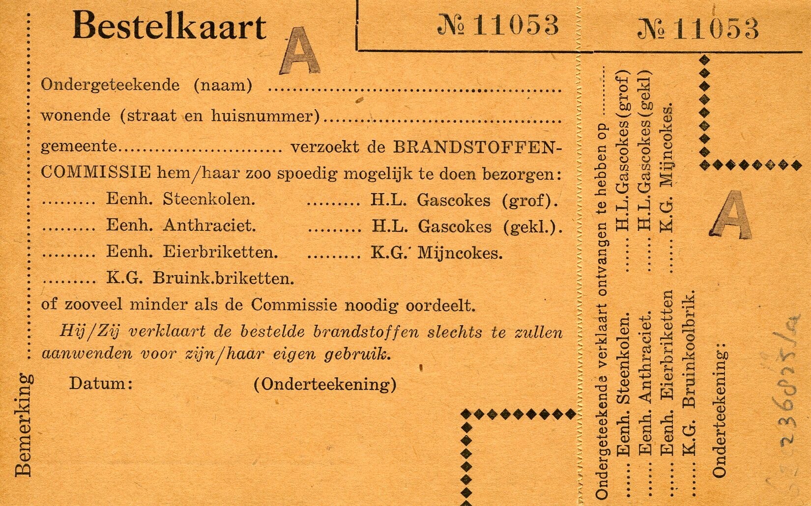 Drie blanco bruine Bestelkaarten A, No. 11053 van de Brandstoffen-Commissie.<br><br>