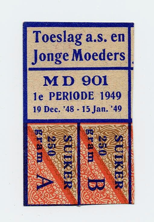 Diverse toeslagbonnen, een controlekaart en een inlegvel voor aanstaande en jonge moeders uit de periode 1948 - 1949. Vijf bonnen voor damesschoenen, beddengoed en zeep voor aanstaande moeders.