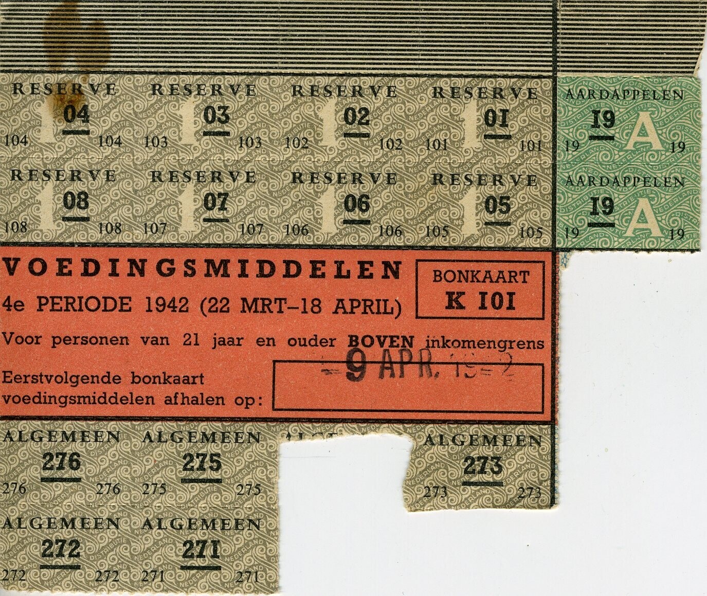 Vier gebruikte voedingsmiddelenkaarten met reserve en algemene bonnen. Op een van de bonkaarten zitten nog twee bonnen voor aardappelen. Twee kaarten hebben een datumstempel van 9 april 1942. De bonnen zijn geldig voor de vierde periode: 22 maart tot en met 18 april 1942.