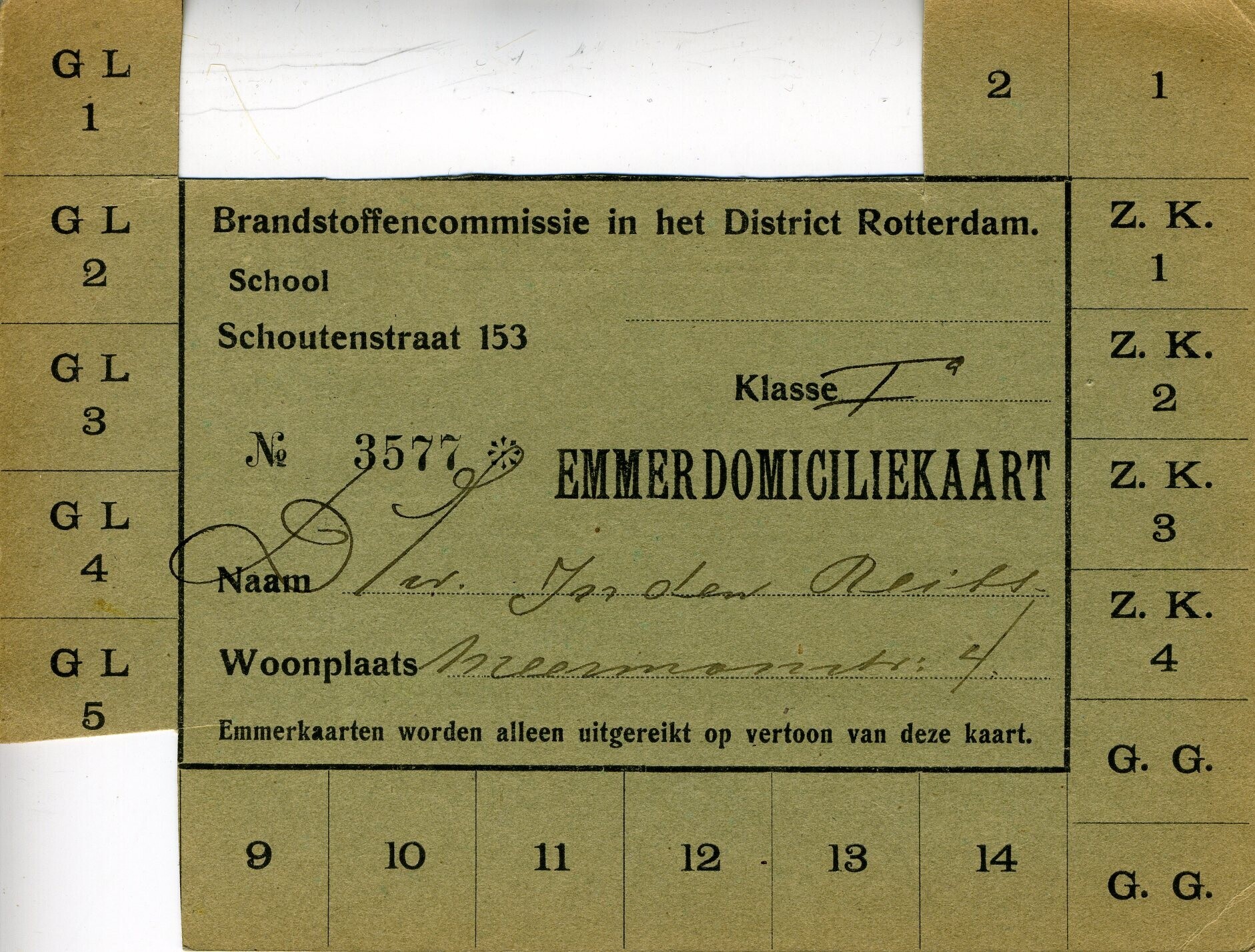 Groene gebruikte Emmer Domiciliekaart van de Brandstoffencommissie Rotterdam. Op de achterkant een waarschuwing over het zoek raken van kaarten.