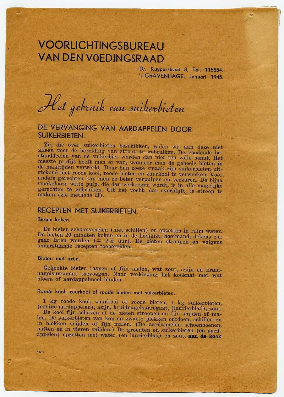 Uitgave van het Voorlichtingsbureau van den Voedingsraad met recepten op basis van suikerbieten.