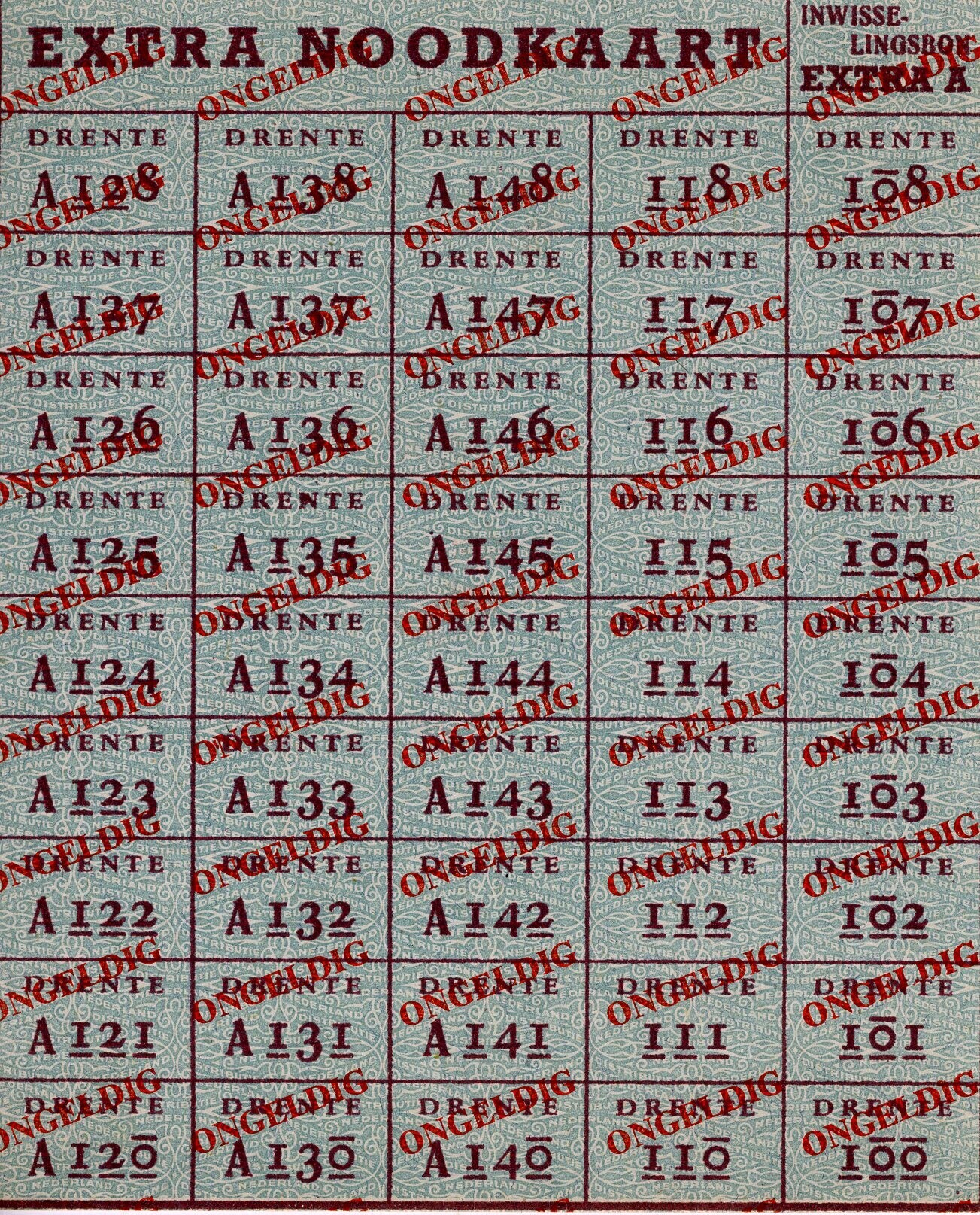 Een verzameling van 20 verschillende Extra Noodkaarten van de provincies Drenthe, Friesland, Groningen, Gelderland en Overijssel. Op de kaarten is in rood gedrukt over iedere aparte bon: ongeldig.