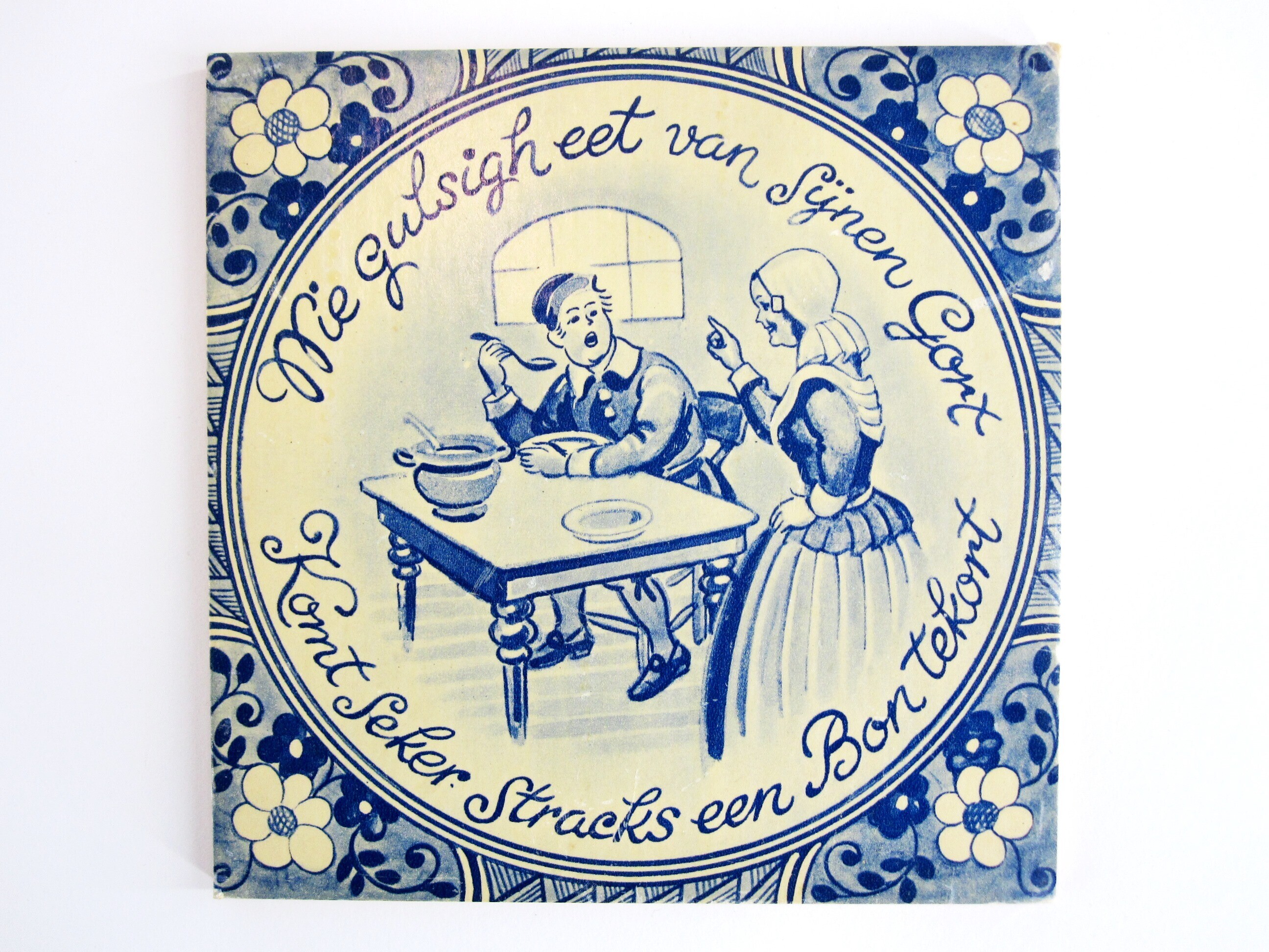 Een kartonnen 'siertegel' in de stijl van de blauwwitte siertegels uit de zeventiende eeuw. In een rond kader zijn in een kamer een man en een vrouw in klederdracht afgebeeld. De man zit te eten aan een tafel terwijl de vrouw een vermanende vinger naar hem opsteekt. Rond dit tafereel de spreuk: "Wie gulsigh eet van sijnen Gort, Komt seker stracks een Bon tekort". Rond het kader een decoratieve bloemenrand. De voorstelling en de spreuk op de 'tegel' bevatten een toespeling op de schaarste tijdens de oorlog.