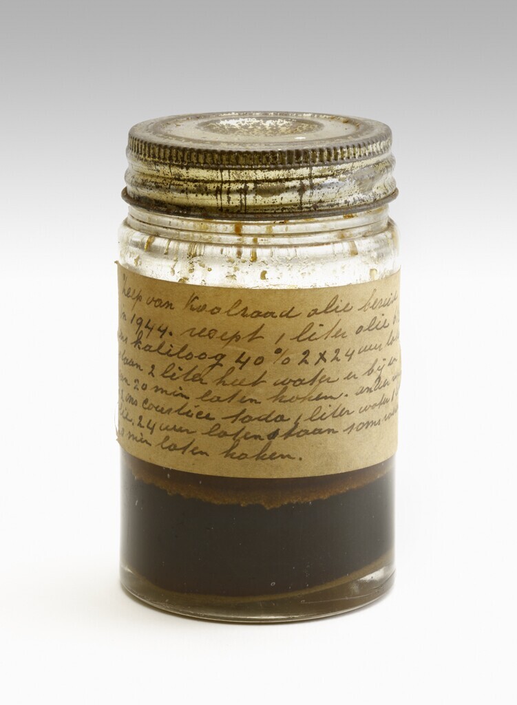 Een glazen pot met metalen schroefdeksel voor ongeveer een derde gevuld met surrogaatzeep gemaakt van koolzaadolie. Op het etiket het recept om deze zeep te maken.