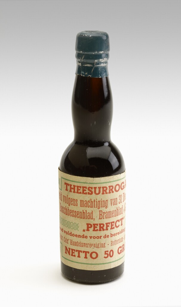 Een nog verzegeld flesje 'Perfect theesurrogaat'. Op het etiket staan onder meer de natuurlijke ingrediënten vermeld.