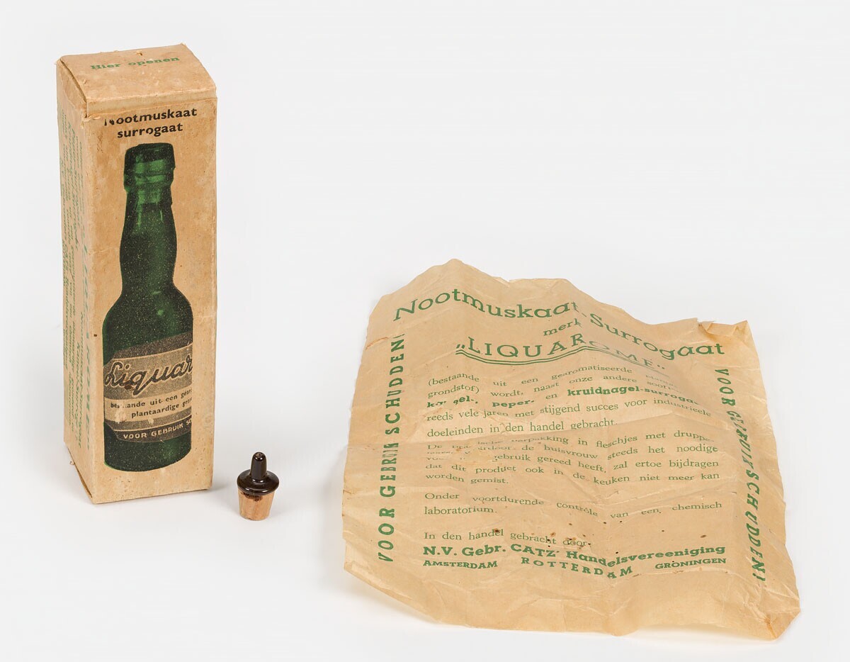 Een doosje met een flesje nootmuskaatsurrogaat van het merk "Liquarome".