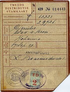 Tweede distibutiestamkaart afgegeven op naam van Johanna Gerritse weduwe van Kroes met losse aardapp...