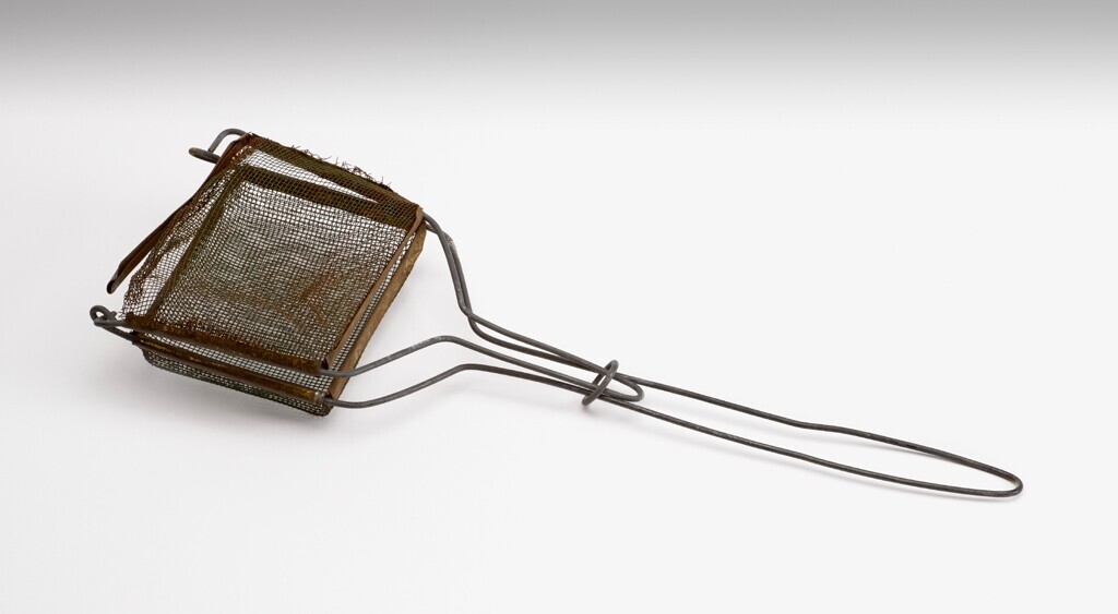 Van draad gemaakt huishoudelijk gereedschap met aan het uiteinde van een lang handvat twee zeefjes w...